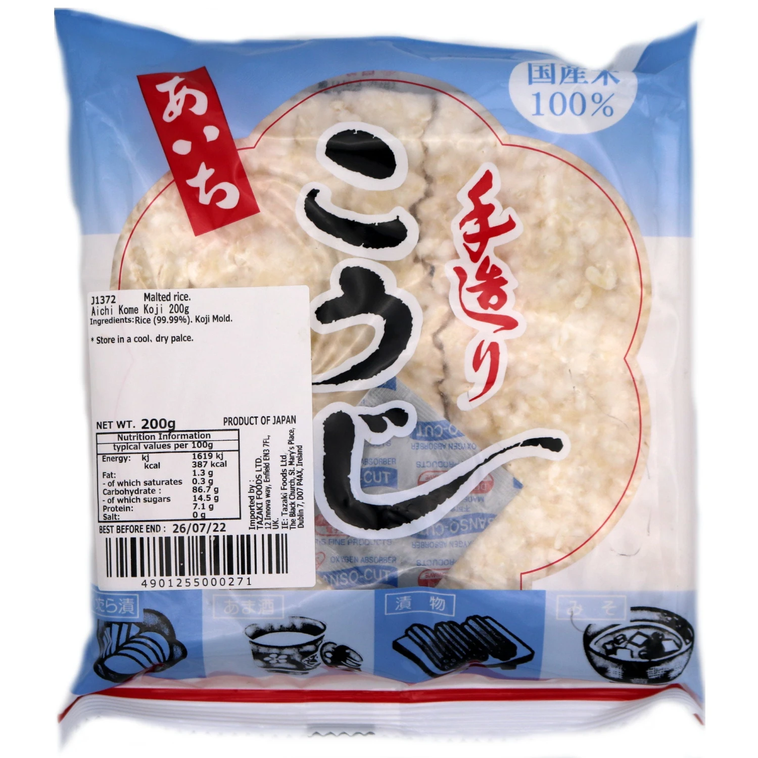Description: Aichi Kome Koji Malted Rice (Japanese Rice Yeast) 200g. This Japanese product is cooked rice and/or soya beans that have been inoculated with a fermentation culture, Aspergillus oryzae. This naturally occurring culture is particularly prevalent in Japan, where it is known as koji-kin. Koji is sometimes translated as “malted rice”
