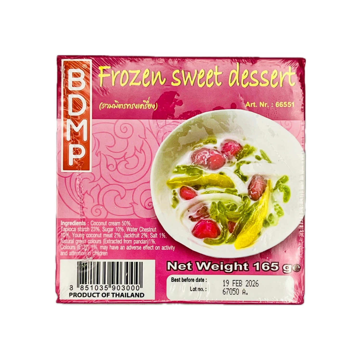 Description: BDMP Frozen Sweet Dessert 165g (Frozen). Discover the delicious taste of BDMP Frozen Sweet Dessert (165g) made with natural coconut water and sweet chestnut. With a unique pandan green colour, this frozen treat is a refreshing for any dessert lover.