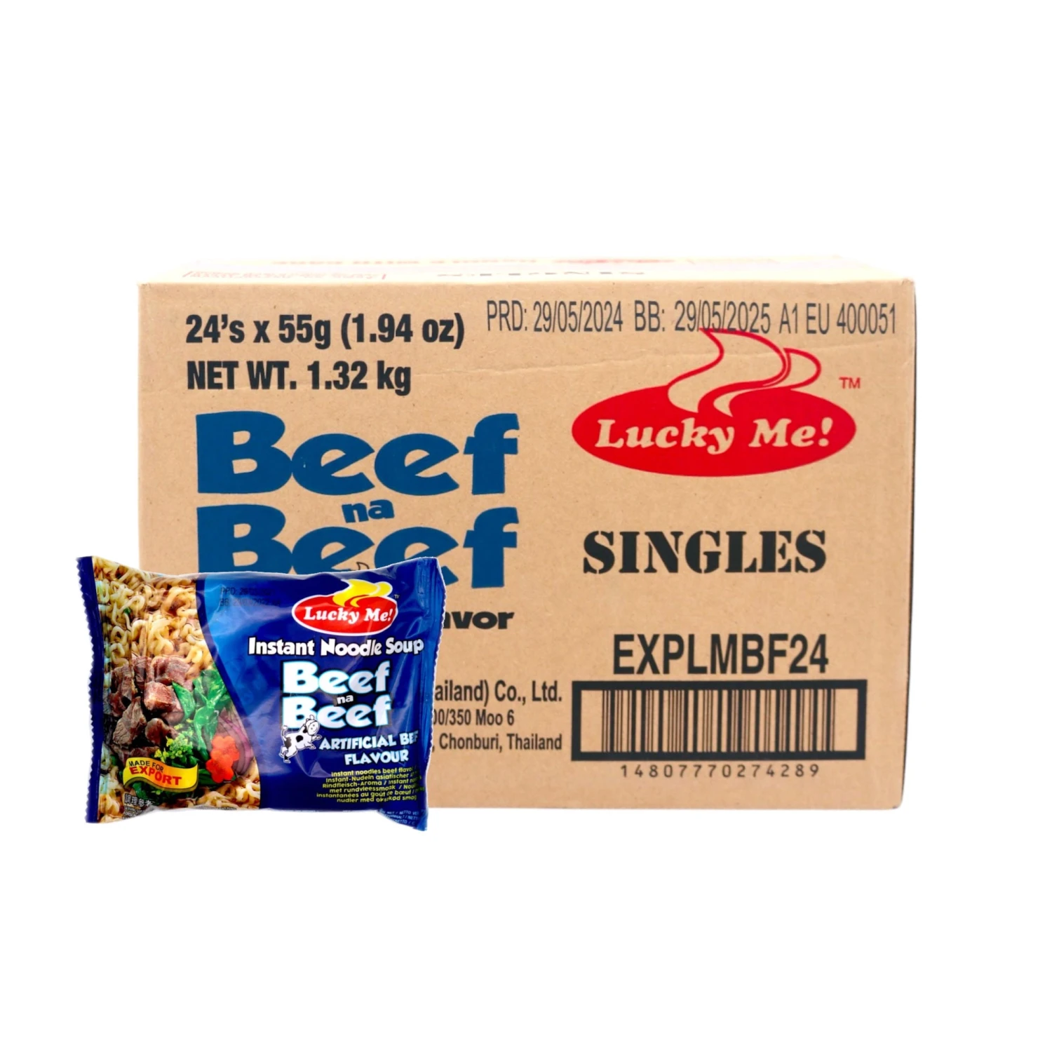 Description: Box of Lucky Me! Instant Noodle Soup Artificial Beef Flavour (55g*24 Packs)(B.B.D 29.05.2025).