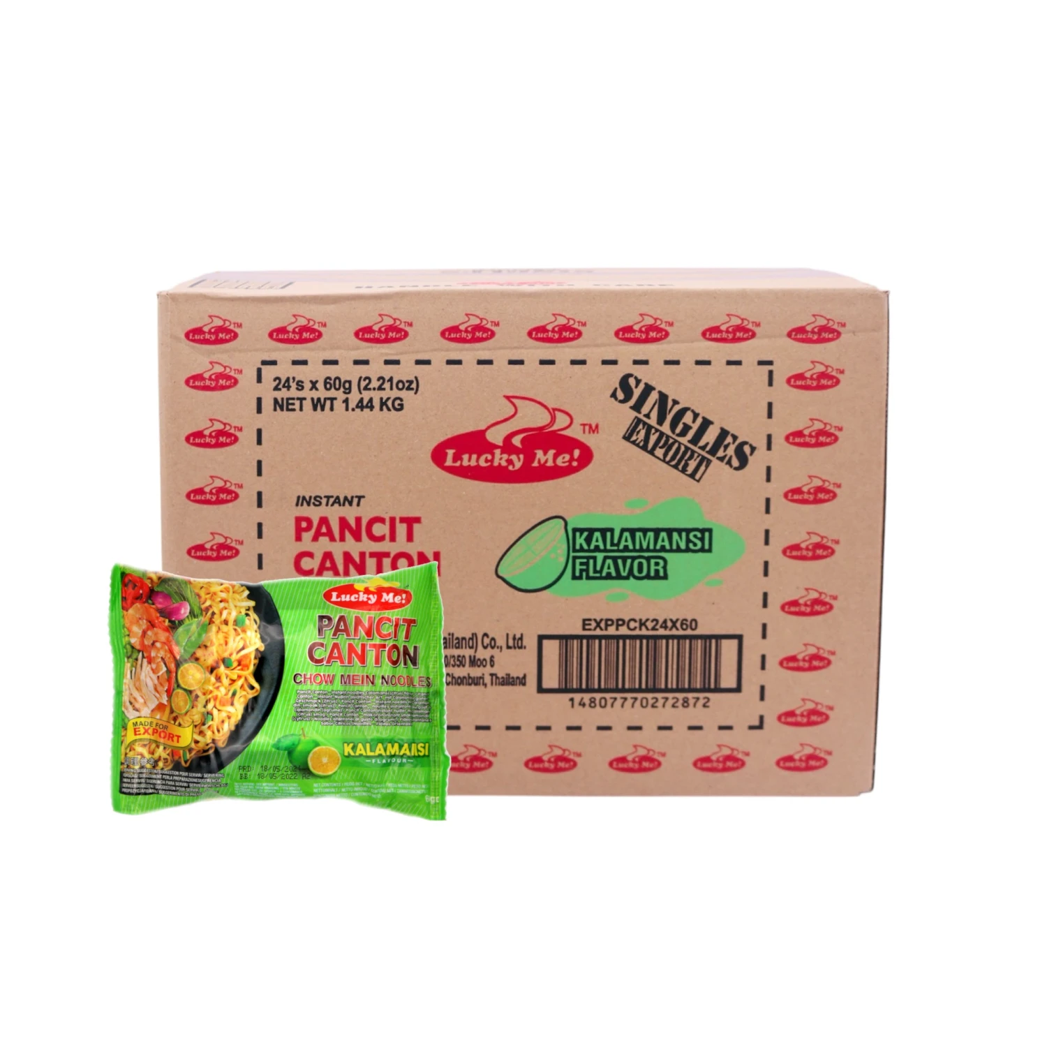 Description: Box of Lucky Me! Pancit Canton Instant Noodles Kalamansi/Citrus Flavour (24Packs*60g). A quick and delicious chow mein noodle dish with a chilli and Philippine lemon flavour! Quick and Easy to make!