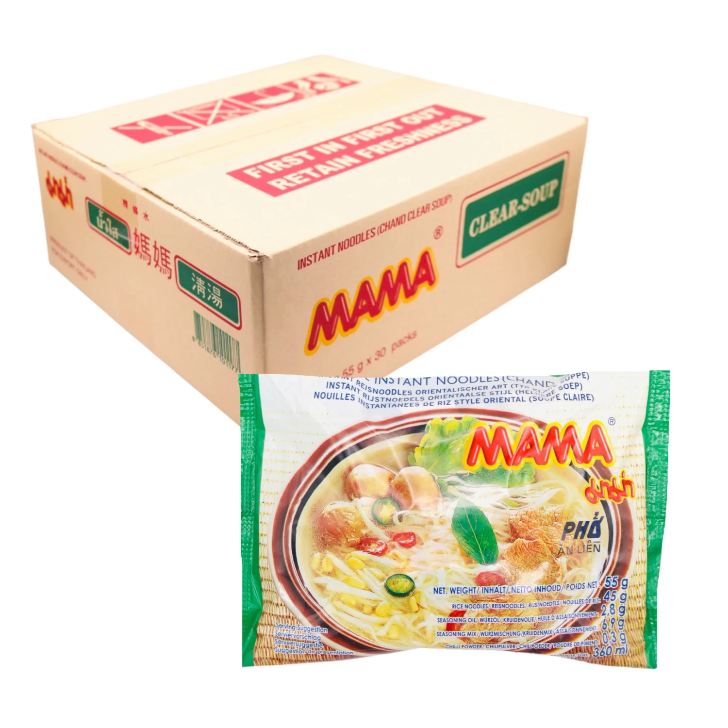 Description: Box of MAMA Instant Chand Noodles With Clear Soup (55g*30Pcs). A quick and tasty way to make one of Thailand’s most beloved dishes.