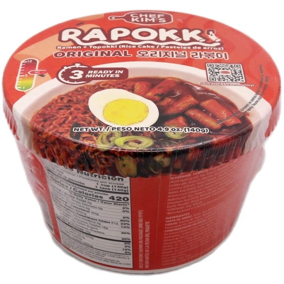 Description: Chef Kim’s Rapokki Bowl (Ramen & Topokki) – Original 140g. Indulge in the delicious fusion of Chef Kim’s Ramen and Topokki, also known as Rice Cakes or Pasteles de arroz. This Original flavour combination offers a unique blend of textures and flavours that will leave you craving more. Enjoy the convenience and taste of this 140g pack.