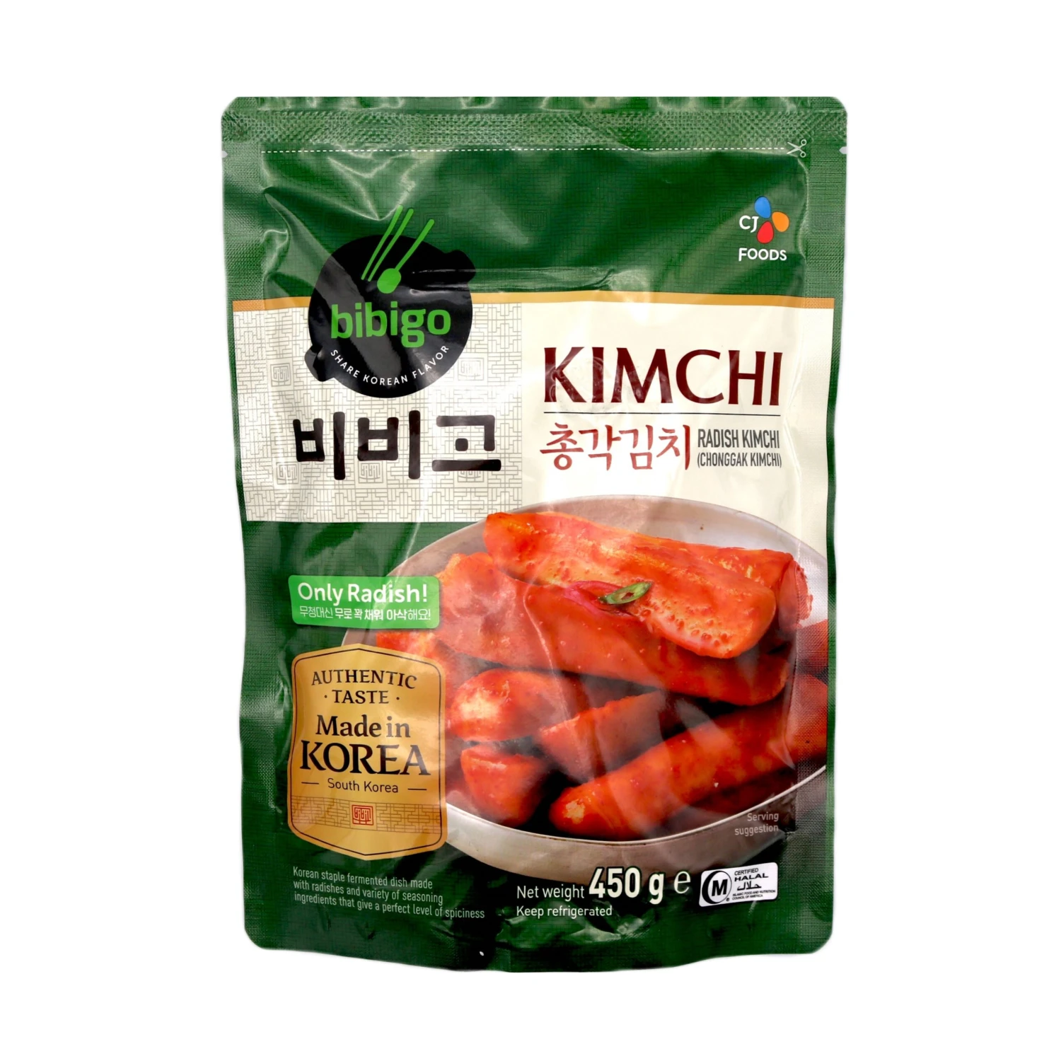 Description: CJ Bibigo Radish Kimchi (Chonggak Kimchi) 450g. A pack of fresh radish kimchi, also known as Chonggak Kimchi, from Korea, perfect for adding a spicy kick to your dishes!