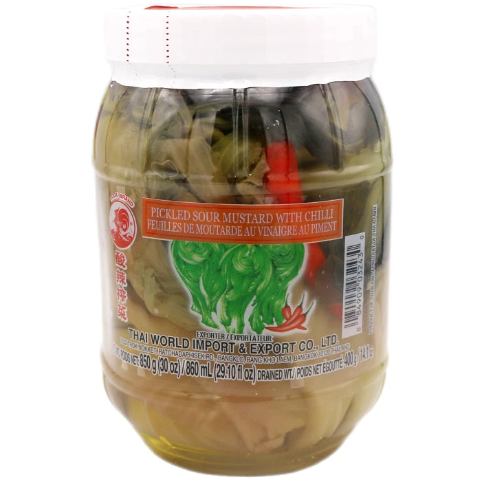 Description: Cock Brand Pickled Sour Mustard with Chilli 850g. Authentic Thai pickled sour mustard with a spicy chili kick. This 850g jar from Cock Brand delivers the perfect balance of tanginess and heat, ideal for enhancing stir-fries, soups, or as a flavourful side dish. The traditional fermentation process ensures genuine depth of flavor that elevates any Asian-inspired meal.