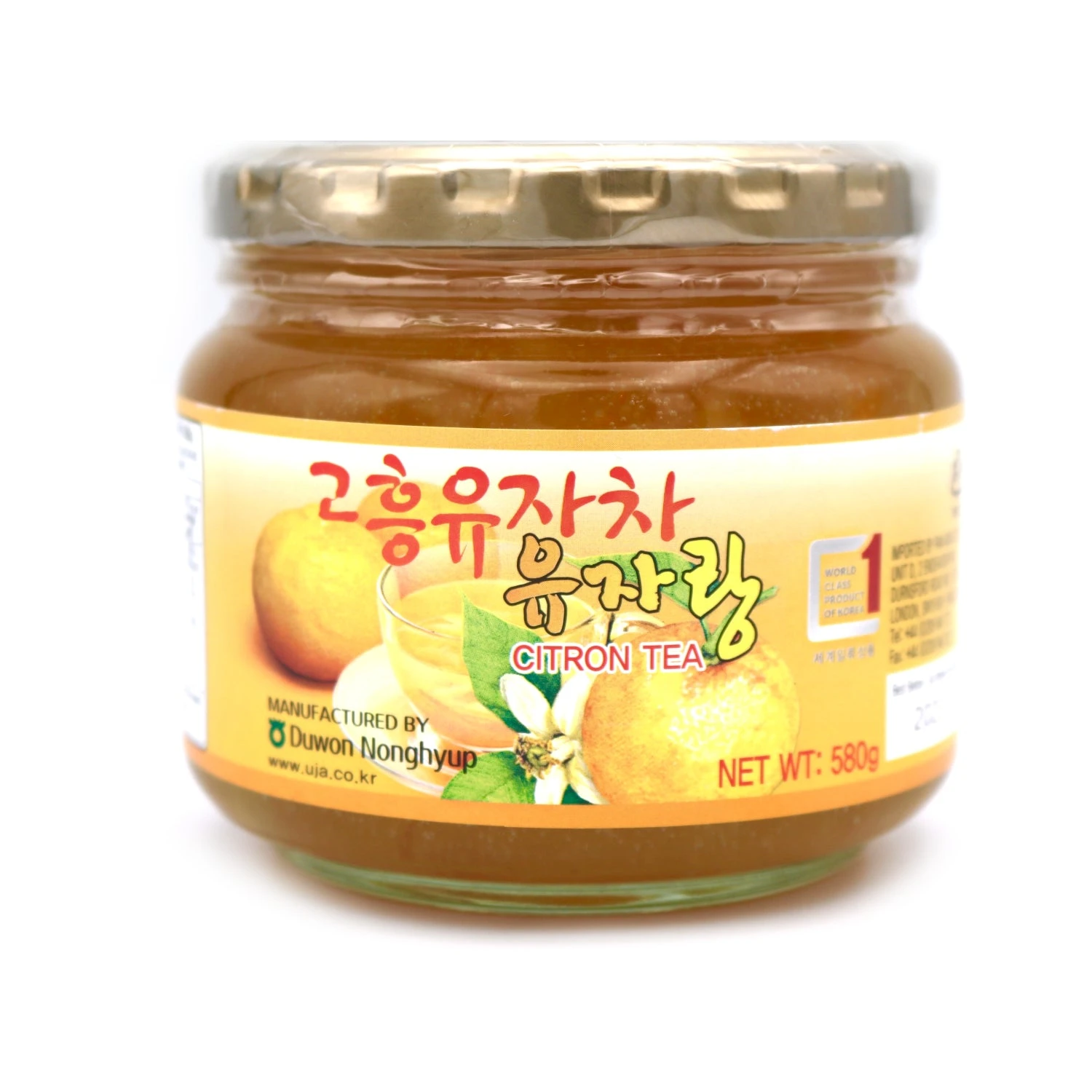 Description: Duwon Nonghyup Citron Tea 580g. A versatile burst of tangy vitamins, rich in healthy Korean tradition. A traditional Korean beverage turned modern trend thanks to its variety of sweet and nutritious capabilities, start your day with a fresh, sharp taste of this juicy citron tea. Made into a marmalade-like jam with Korea’s traditional yuja citrus fruit and sugar, this traditional tea serves spoonfuls of tart, tangy and fruity sour mixture that is easily stirred and dissolved into water for Vitamin C rich refreshment. A perfect cure for chills when served hot and zestily refreshing chilled, this caffeine-free tea can even be spread over toast or crackers for a fragrant pick-me-up breakfast or snack.