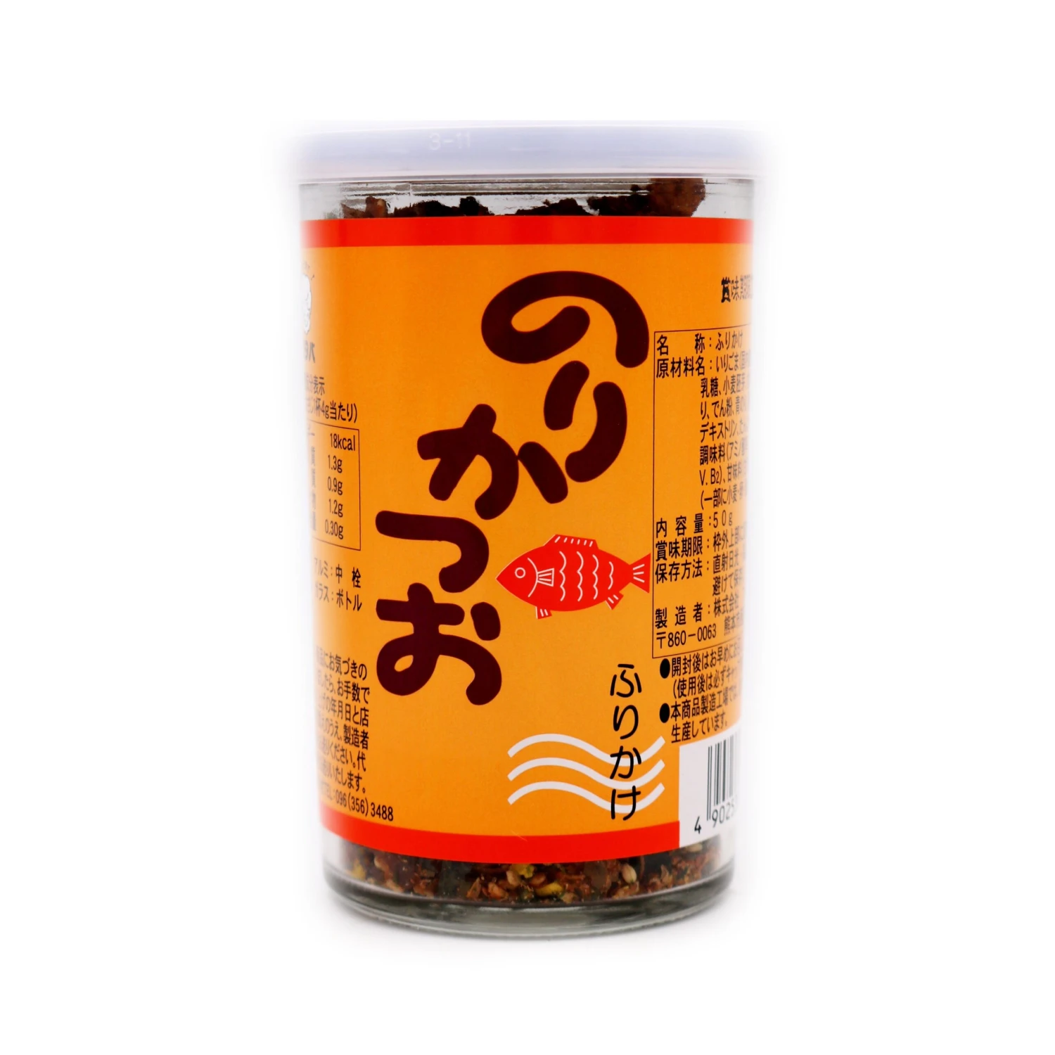 Ingredients: Roasted White Sesame Seed, Dried Fish Flake (22%), Sugar, Lactose (Milk), Wheat Germ, Salt, Soy Sauce (Water, Salt, Defatted Soybeans, Wheat), Powdered Egg Yolk, Dried Nori Seaweed (3.5%), Starch, Flavour Enhancer: E621, E640, E635, Flavourings: E311, E508 and E327, Dired Aonori Seaweed (1.5%), Fermented Seasoning (Glucose Syrup, Fructose-Glucose Syrup, Sugar, Rice, Salt, Rice Koji), Yeast Extract, Maltodextrin, Hydrolysed Protein (Soybeans, Corn, Wheat, Yeast), Colours: E160c, E160a and E101, Liquorice Extract, Antioxidant: E330, Garlic, Licorice Antioxidant: E300.