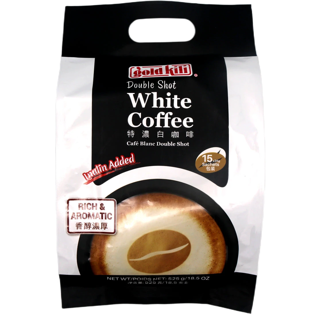 Description: Gold Kili Double Shot White Coffee (35g*15pcs) 525g. Experience the rich intensity of Gold Kili Double Shot White Coffee, a premium blend designed for coffee connoisseurs. Each box contains 15 convenient 35g sachets (525g total), delivering a robust, full-bodied flavor with enhanced caffeine content. The perfect balance of strength and smoothness makes this an ideal choice for those seeking a more powerful coffee experience.