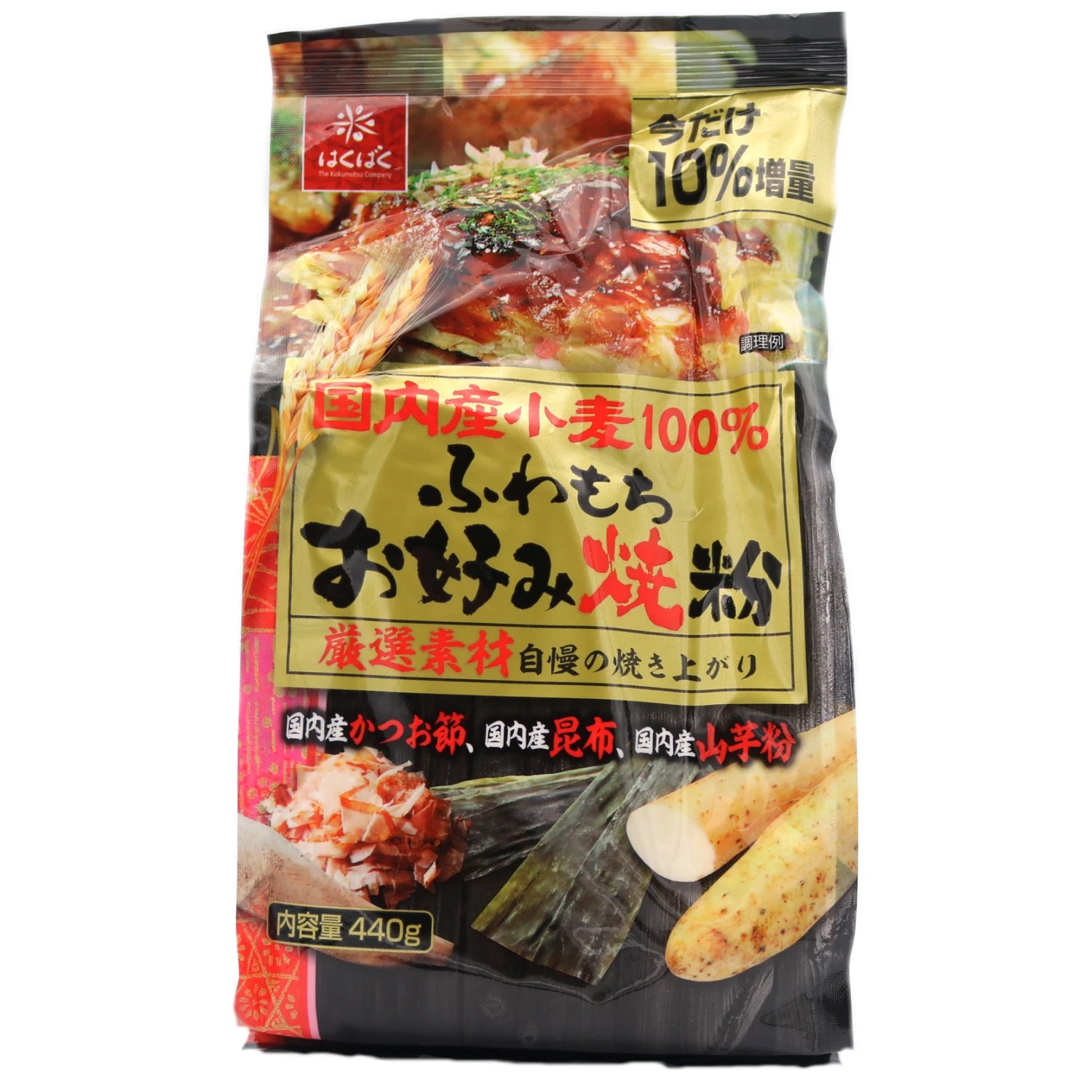 Description: Hakubaku Okonomiyaki Flour Mix 400g. Hakubaku Okonomiyaki Flour Mix uses Japanese domestically produced wheat. Its ground specifically for pancake is pre-mixed with powdered “Dashi”(broth) such as Bonito flake, Kelp, and yam. It makes your Okonomi-Yaki very fluffy. Therefore it’s delicate, rich, and delicious as if at an authentic Okonomiyaki restaurant in Japan.Okonomi-Yaki is a pancake typically stuffed with cabbage, topped with pork or shrimp, and dressed with a Japanese Mayonnaise and okonomiyaki sauce.