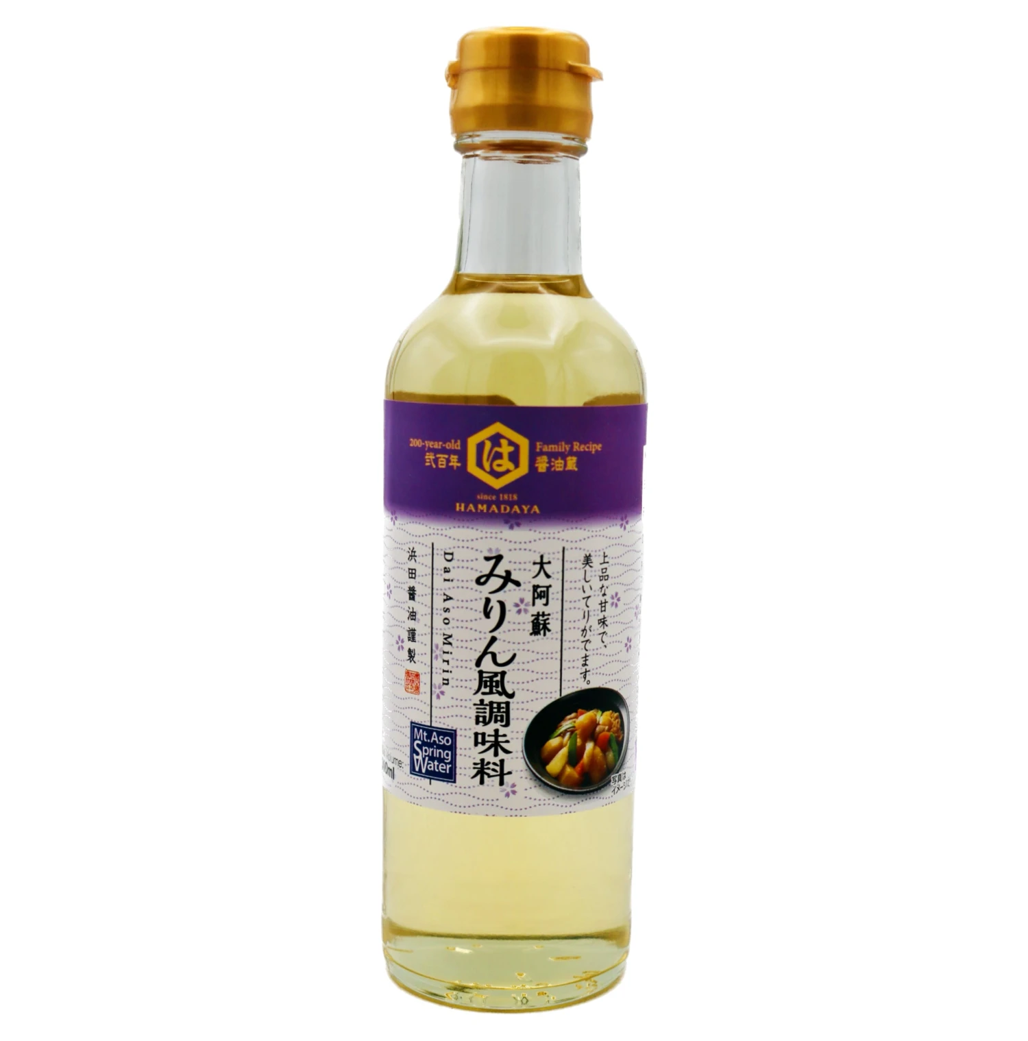 Description: Hamadaya Dai Aso Mirin 300ml. With malted rice and koji as base ingredients, this mirin-style seasoning condiment has a subtle and refreshing sweetness produced by mirin-brewing techniques. Perfect for glazing dishes, it can be used with Hamada VII Soy Sauce to broaden your cooking repertoire.