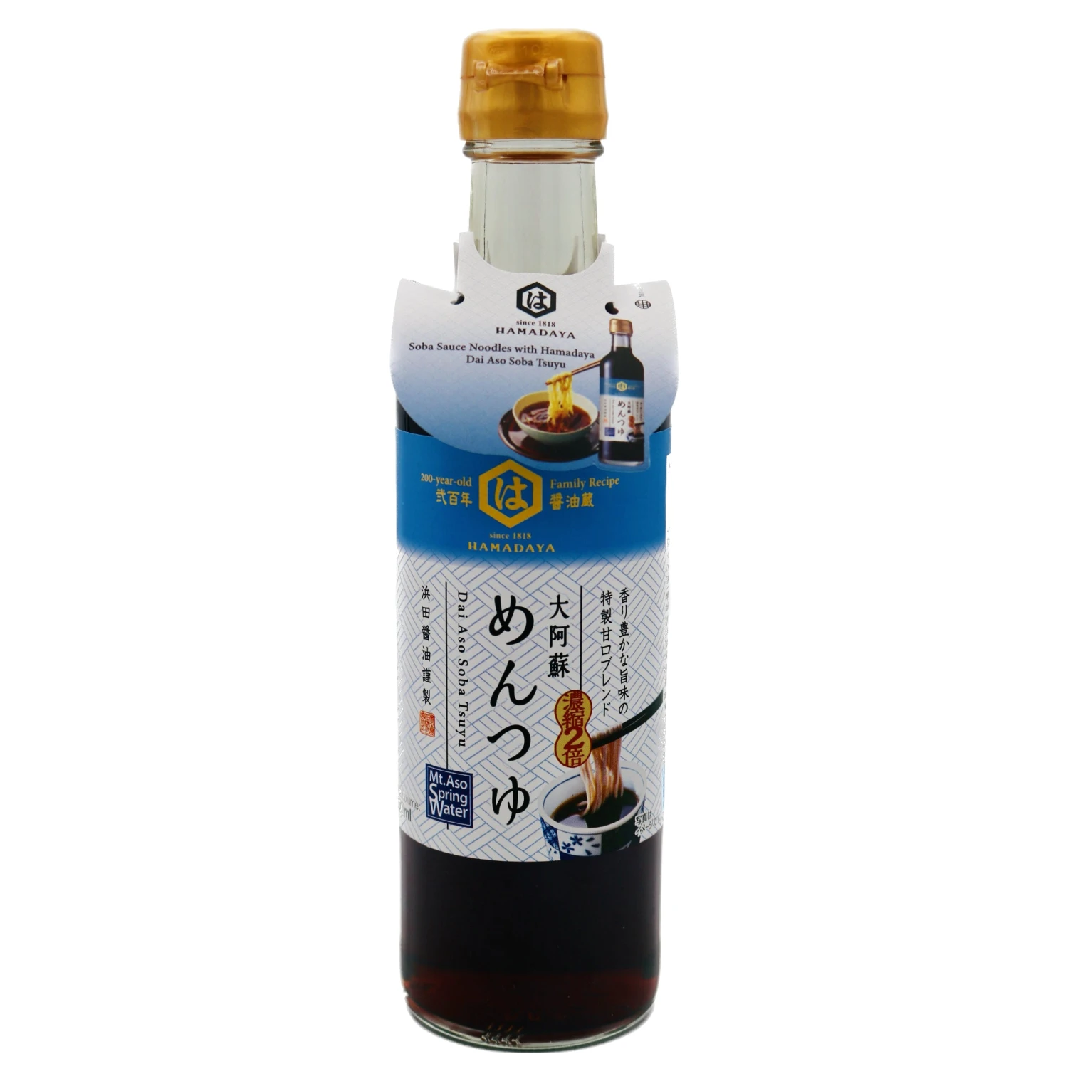 Description: Hamadaya Dai Aso Soba Tsuyu 300ml. Made with superior Hamada VII Naturally Brewed Soy Sauce, this condiment combines the essence of ingredients such as kombu (seaweed), mushrooms and bonito. Dilute with warm or cold water according to preference as an authentic-tasting and flavourful noodle sauce.