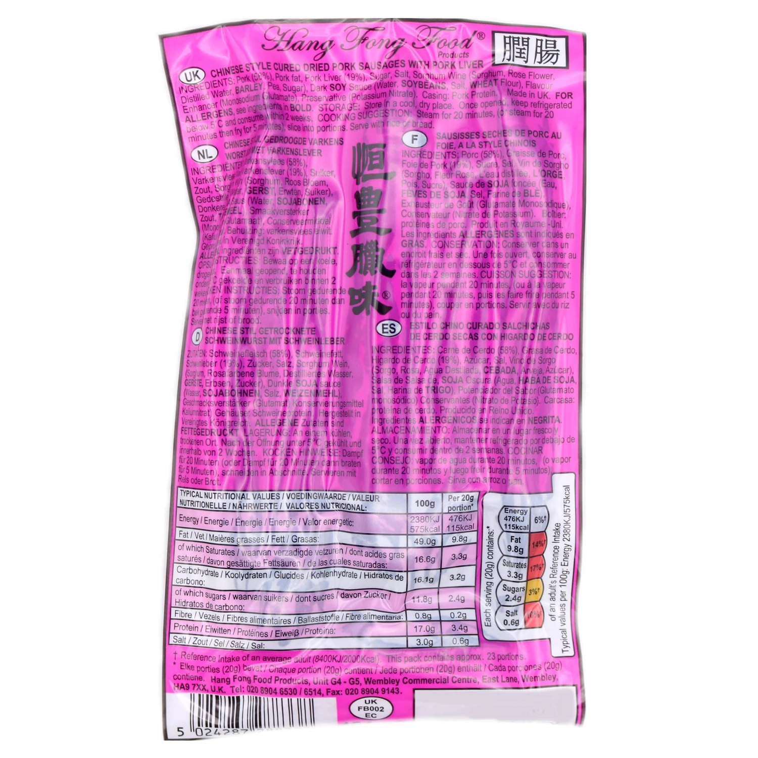 Description: Hang Fong Chinese Style Cured Dried Pork Sausages with Pork Liver 454g. Perfect for adding to fried rice or a Chinese omelette!Â