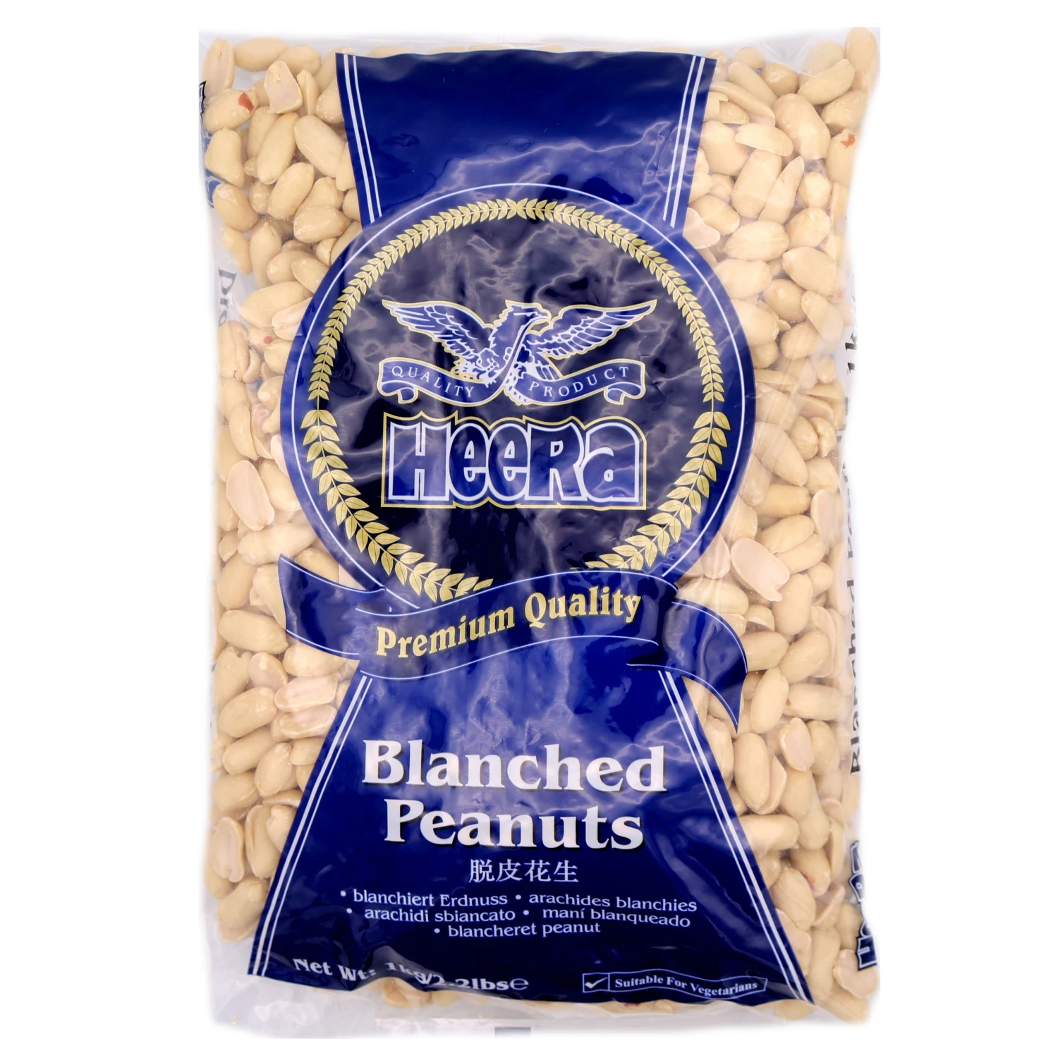 Description: Heera Blanched Peanuts 1KG. A packet of delicious peanuts, with skin removed. The process has left the peanuts with a delicious, milky coloured peanut perfect for cooking with. Suitable for vegetarians.