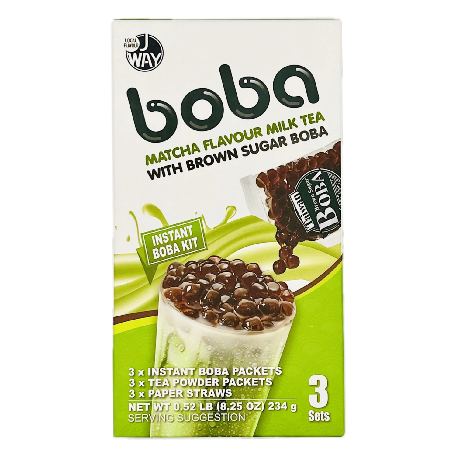 Description: J WAY Brown Sugar Boba Matcha Flavour Milk Tea (3 set) 234g. Indulge in the perfect balance of rich matcha flavour and chewy brown sugar boba with J WAY’s Brown Sugar Boba Matcha Flavour Milk Tea. This set comes with three 234g packages, making it easy to enjoy your favourite drink anytime. Satisfy your cravings and elevate your tea-drinking experience with J WAY.