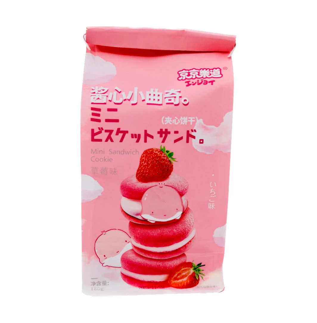 Description: JJLD Mini Sandwich Cookie Strawberry Flavour 180g. Indulge in the delicious, fruity flavour of JJLD Mini Sandwich Cookies! Made with real strawberry flavour, each 180g pack is perfect for snacking on the go or enjoying with a cup of tea. With a convenient size and mouth-watering taste, these cookies are a must-try for any sweet treat lover.