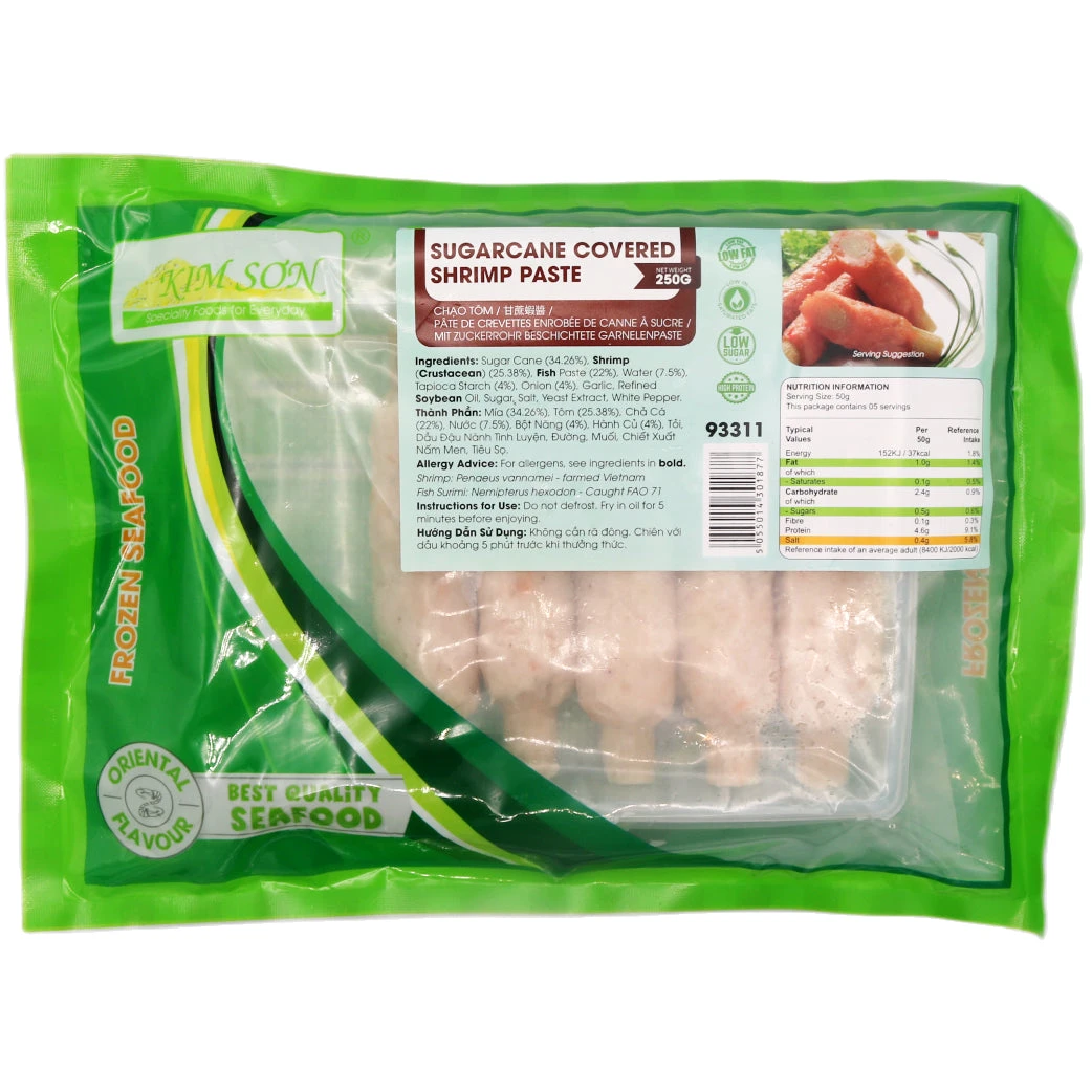 Description Kim Son Sugarcane Covered Shrimp Paste 250g (Frozen). Experience a unique blend of flavours with Kim Son Sugarcane Covered Shrimp Paste. Made with high-quality shrimp and covered in sugarcane, this 250g frozen delight is sure to tantalize your taste buds. Enjoy the perfect balance of sweetness and savoury in every bite.