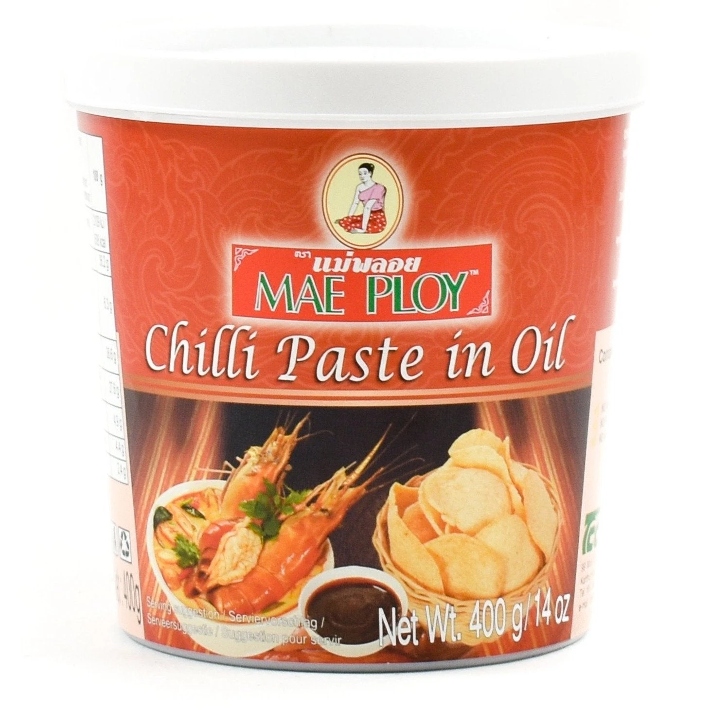 Description: Mae Ploy Chilli Paste In Oil 400g. Use this Mae Ploy chilli paste to give extra kick to Thai soups and sauces. The soy, shrimp and fish sauce contained in this chilli paste makes it a perfect match for prawn Tom Yum soups. The paste has a lovely blend of hot, sweet and sour flavours.