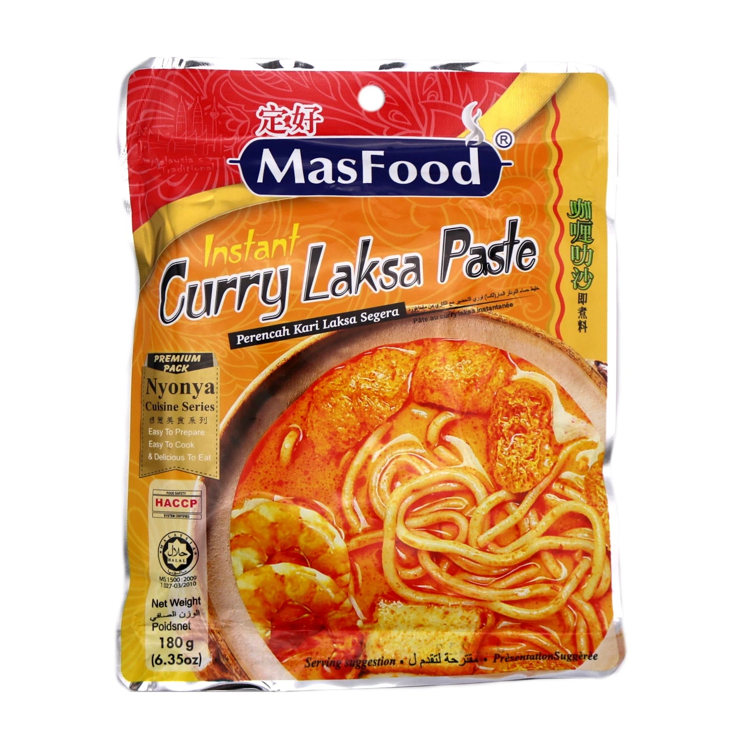Description: Masfood Instant Curry Laksa Paste 180g. A packet of delicious laksa curry paste, perfect for a quick and tasty laksa curry dish.
