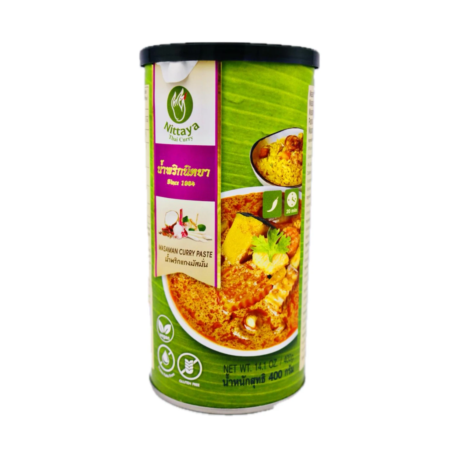 Description: Nittaya Masaman Curry Paste 400g. Crafted from a blend of herbs and spices, Nittaya Masaman Curry Paste delivers authentic and flavourful Thai cuisine. Enjoy the benefits of a rich, creamy, and aromatic curry dish in just minutes. Gluten-free and made with all natural ingredients, it’s the perfect choice for a quick and delicious meal.