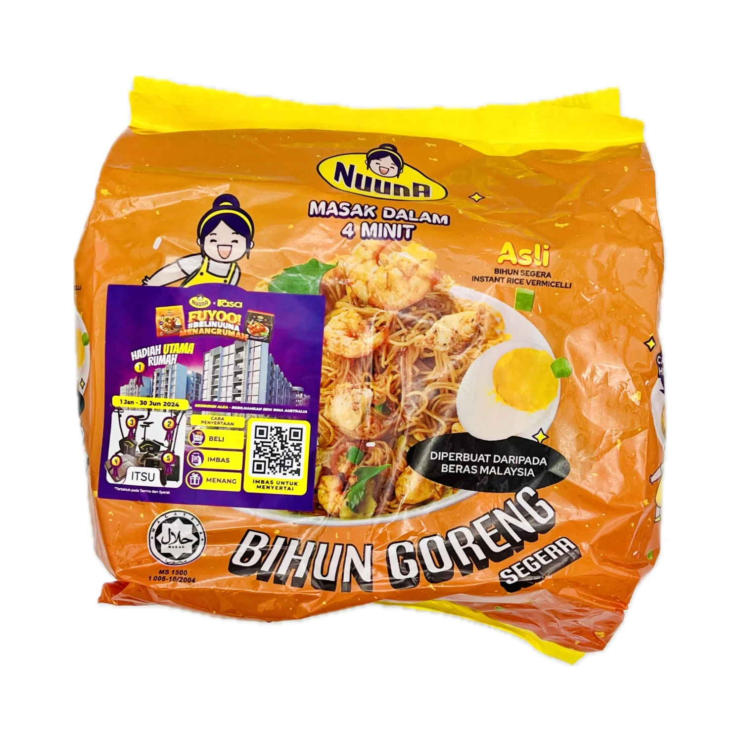 Description: Nuuna Instant Fried Vermicelli Dry Stir Original Flavour (65g* 5 bags) 325g. Nuuna’s Fried Vermicelli is a convenient, flavourful meal option for busy days. Each bag contains 65g of dry stir-fried vermicelli, with a delicious original flavour. With 5 bags in each pack, totalling 325g, this product is perfect for satisfying cravings in a quick and easy way.