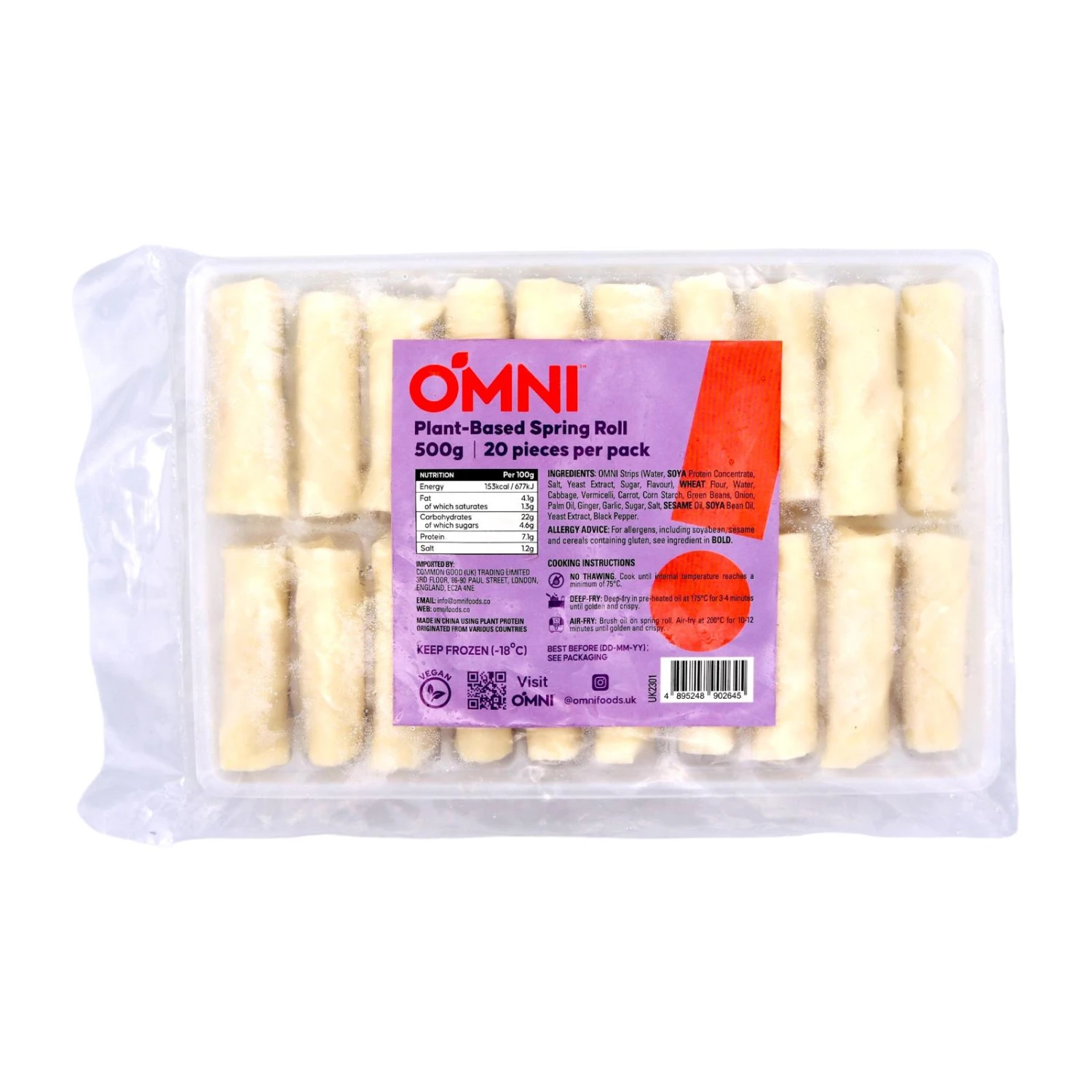 Description: Omni Plant-Based Spring Roll 500g (Frozen). A packet of plant-based spring rolls. Suitable for vegan.