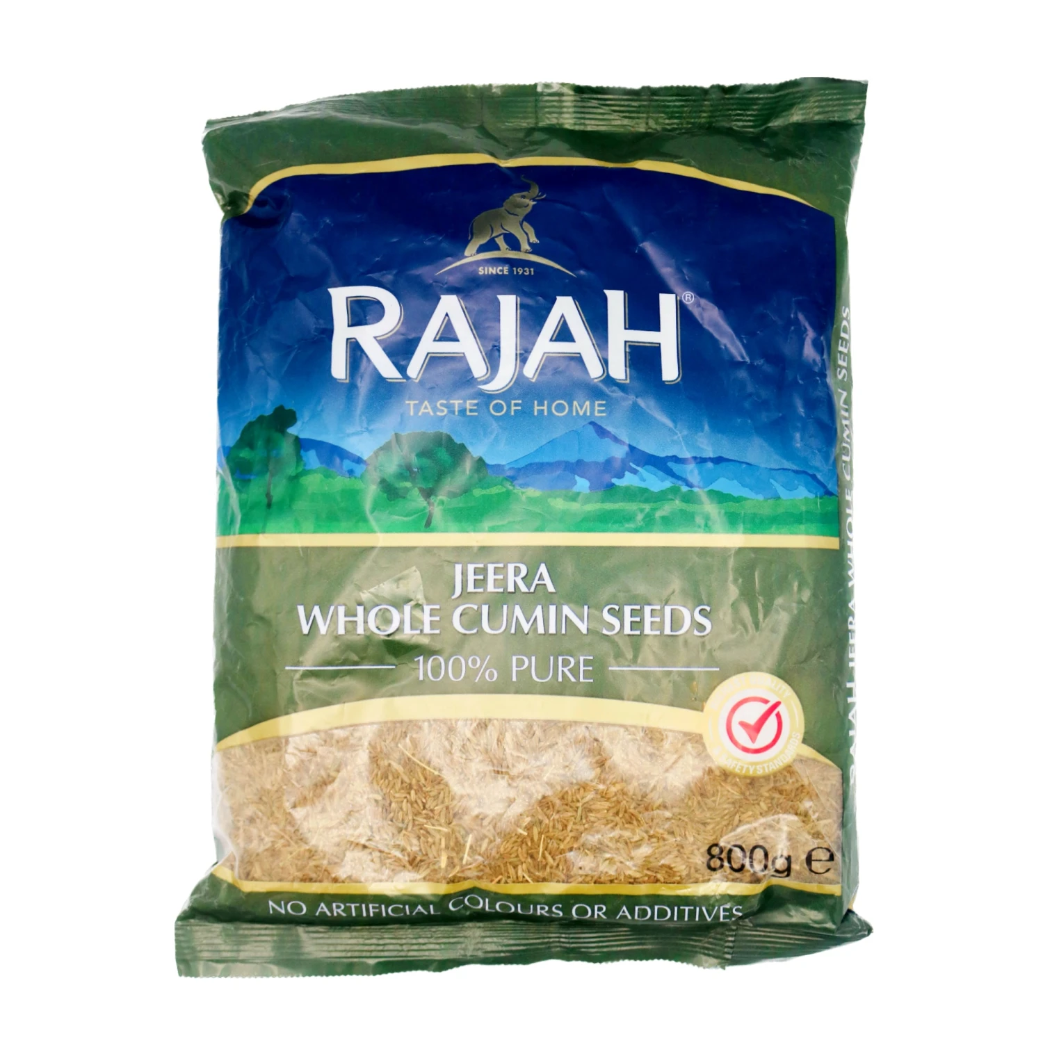 Description: Rajah Jeera Whole Cumin Seeds 800g. Rajah Jeera Whole Cumin Seeds 800g are the perfect addition to meals. These cumin seeds are a powerful source of antioxidants, trace minerals, and vitamins, providing numerous health benefits. The distinct flavor will enhance the taste of your dishes without overpowering them.