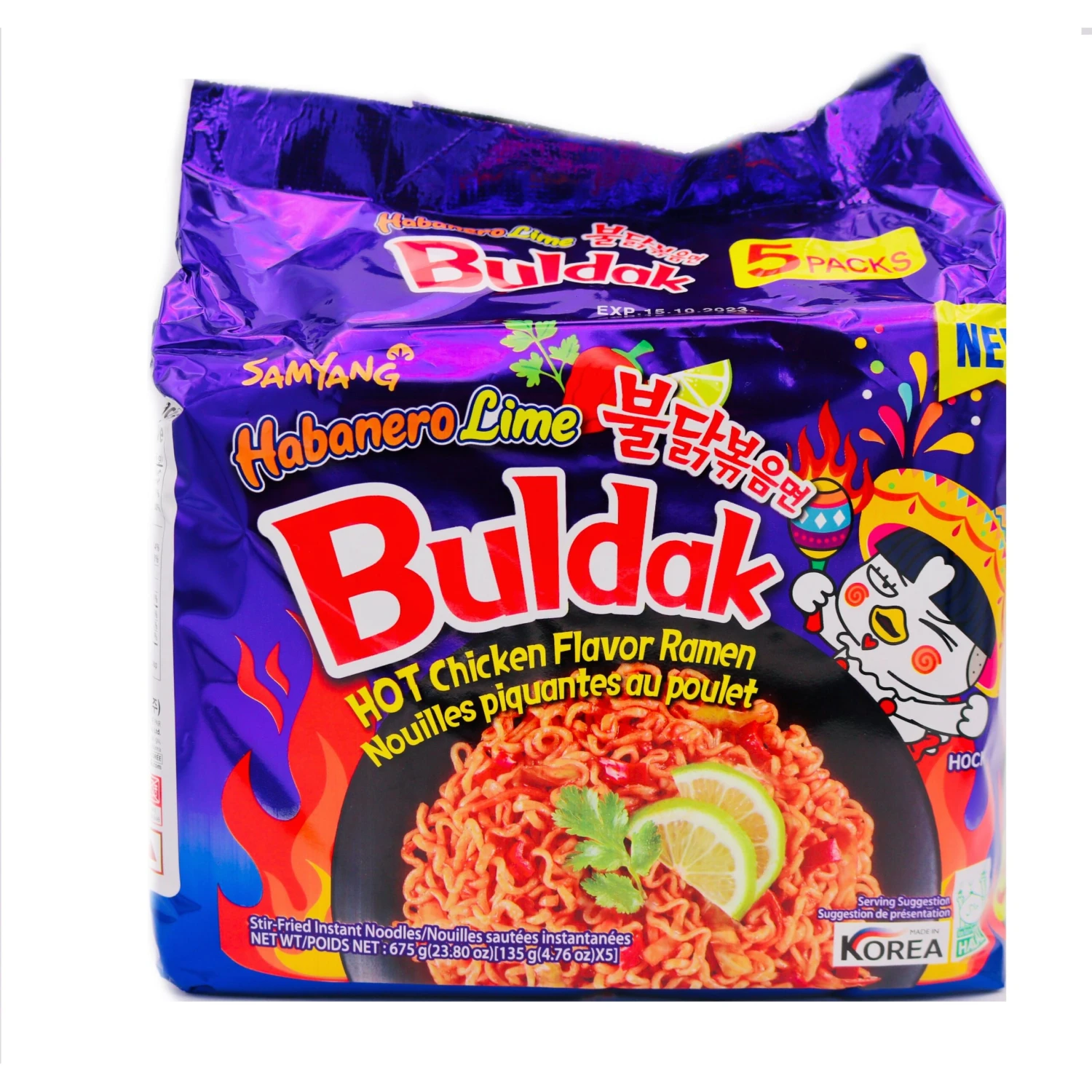 Samyang Buldak Habanero Lime Stir Fried Ramen Spicy Hot Chicken Flavour (135g*5Pcs) 675g is a flavour-packed sensation made from the finest wheat flour and modified tapioca starch that combines a harmonious blend of spices, zesty lime, and a fiery kick that will leave you wanting more.Â