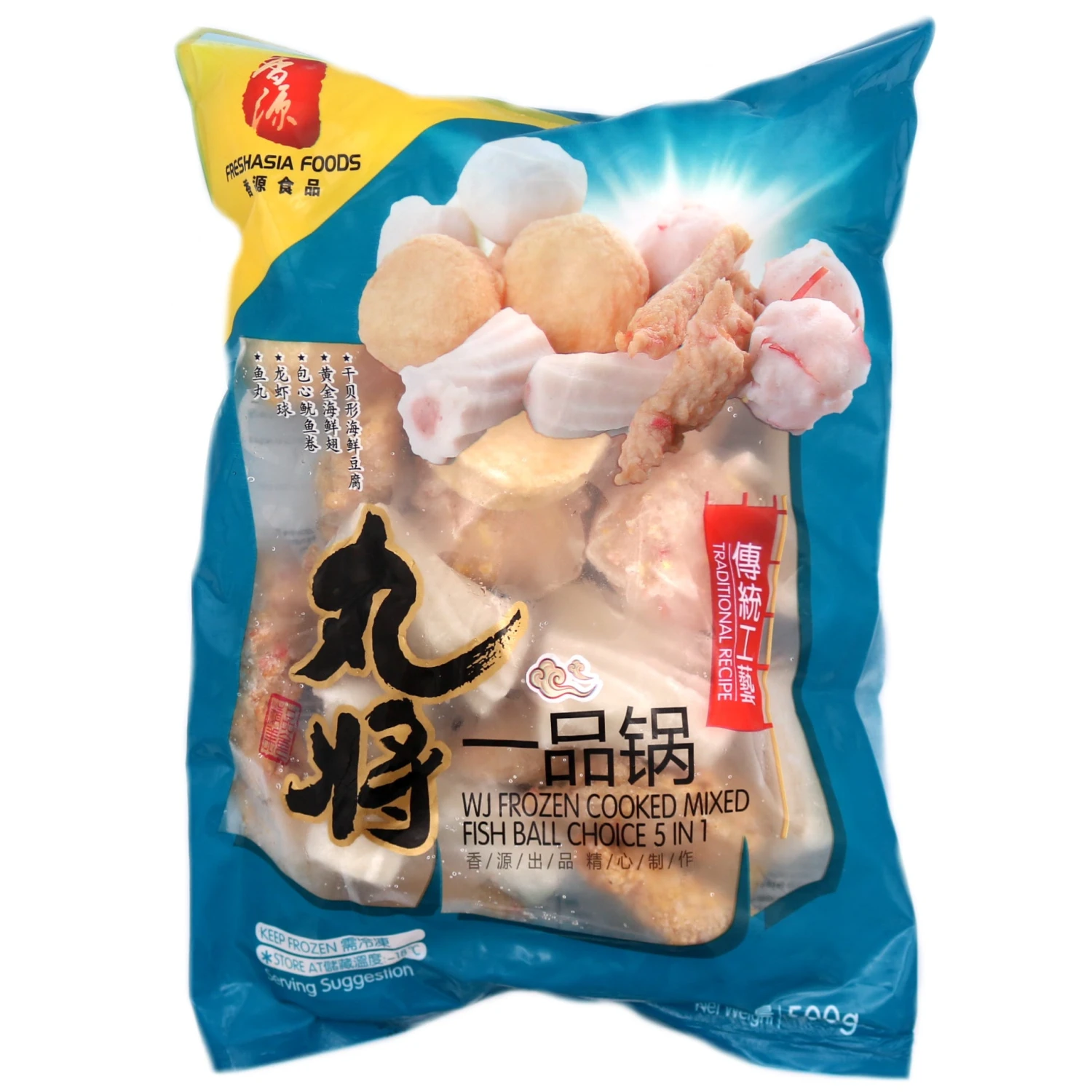 Description: WJ Mixed Fish Ball Choice 5 In 1 500g (Frozen). A bag of mixed fish balls, perfect for using in hot pot dishes.